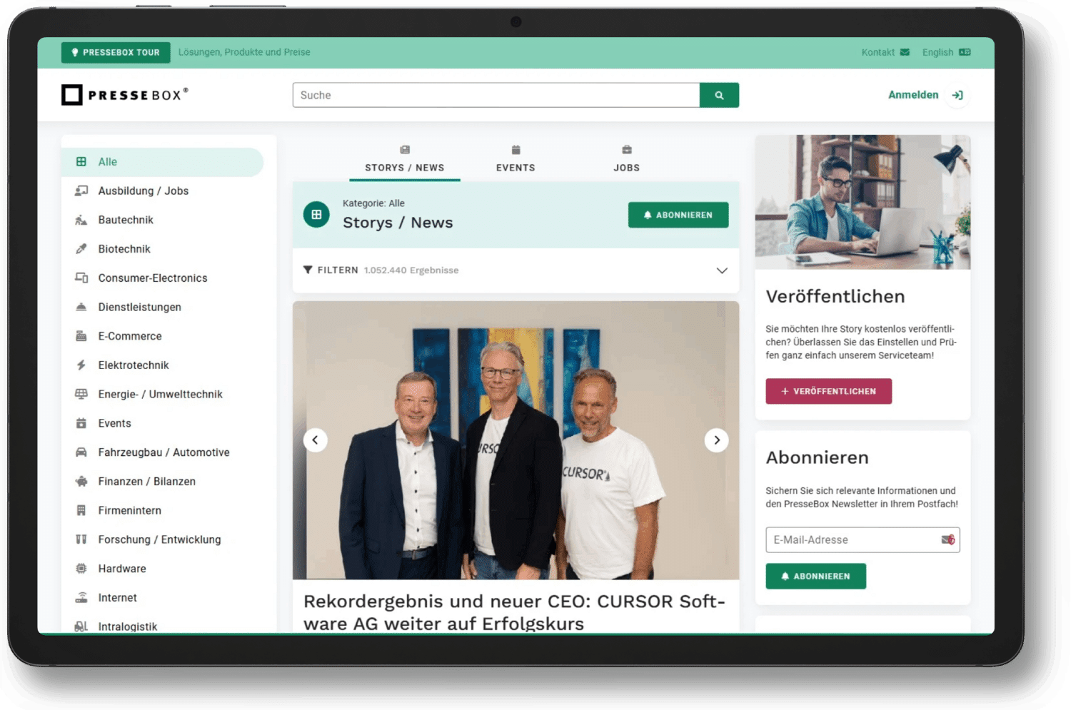 Ihre Inhalte erscheinen direkt auf der PresseBox – suchmaschinenoptimiert, thematisch platziert und automatisch Google-indexiert. Dank intuitivem Workflow veröffentlichen Sie in kürzester Zeit – effizient, strukturiert und ohne Mehraufwand.